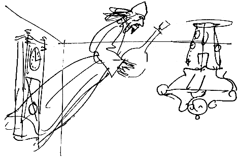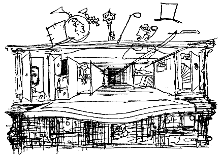 …Я сам однажды видел в театре Попечительства о народной трезвости, притаясь за кулисами, как машинист сцены тряс лист кровельного железа, подвешенный к колосникам, как он изредка бил по нему барабанной колотушкой, а в это время притихшие зрители слышали раскаты грома, видели в окнах декораций вспышки молний, и Герцог с приклеенной бородкой, отряхая с плаща струи воображаемого ливня, шагая по доскам сцены клеенчатыми ботфортами, с разноцветными буфами на рукавах, напоминавшими бумажные японские фонарики, пел изо всех сил, желая перекричать бурю в оркестре: