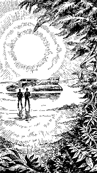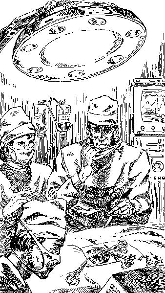 «От исследования планеты в одиночку пришлось отказаться. Нельзя рисковать, оставив Дока без помощи. Пока костные переломы срастаются плохо. К тому же все время приходится защищаться. Миражи теперь не уходят от человека, а наступают и преследуют. Я встретил зеленый смерч уже в нескольких метрах от станции. Он шел прямо на меня и, вероятно, мог бы догнать, если б я не опередил его, добравшись до двери. В другой раз мы увидели из окна тропический лес, возникший рядом. Я вышел — лес придвинулся ближе. Если б не излучатель, ветка гигантского папоротника успела бы хлестнуть меня, но я вовремя срезал ее пучком пламени. И все исчезло».