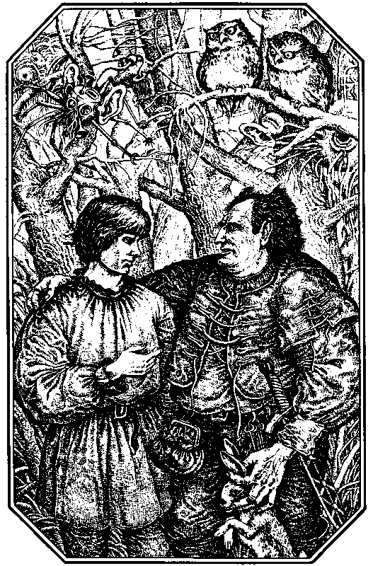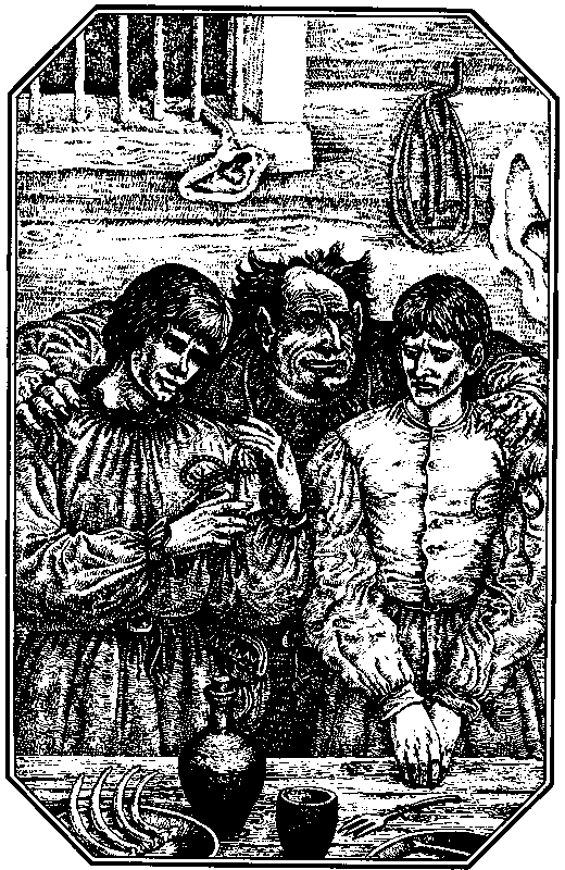 «Именем Черного Мельника заклинаю вас — повинуйтесь!» — чуть не плача, взмолился управляющий. Вместо ответа верзила бунтарь затягивает «Близок день!» и размахивает косой в такт пению. А толпа все прибывает и прибывает — вот-вот замкнется кольцом. Опрометью кинулся верный слуга назад, к мельнику. А тому и спрашивать ни о чем не надо — одного взгляда достаточно. «Свиньей ты был, свиньей и останешься' — рявкнул мельник и прикосновением палочки отправил верного слугу в свинарник. — Всех обращу в свиней, всех поголовно! — бушует мельник. — А этого верзилу с косой сгною заживо!»