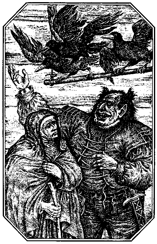 Двенадцать раз ловит ртом воздух мельник — и никак не может подняться. Еще один вдох, и он поднимается, но с трудом держится на ногах: невыносимая тяжесть давит его к земле. Черный пот выступает из пор. Пошатнувшись, он распластывается на сундуке и вновь поднимается, дрожа всем телом. Но вот силы окончательно ему изменяют, и он опускается на четвереньки. Пальцы на ногах и руках загибаются крючьями — это уже волчьи лапы с острыми когтями. Кожа покрывается бурой шерстью. Содрогнувшись от ужаса, сердце бьется по-волчьи и гонит кровь к голове. Та принимает очертания волчьего черепа. Страшная пасть открывается, И огромный серый волчище издает такой жуткий вой, что деревья в лесу вздрагивают.