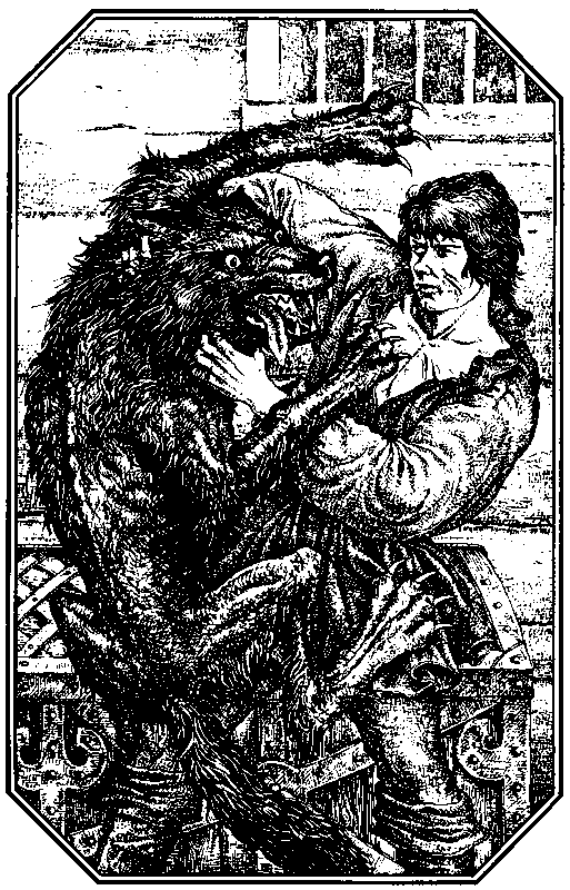 На пороге комнаты вырастает Крабат. Волчьи глаза загораются кровожадным огнем, губы вздергиваются, обнажая могучие клыки, брюхо подбирается, и, собрав всю силу своих стальных мышц, волк в огромном прыжке обрушивается на Крабата. Крабат успевает увернуться, и руки его клещами смыкаются на волчьем горле.