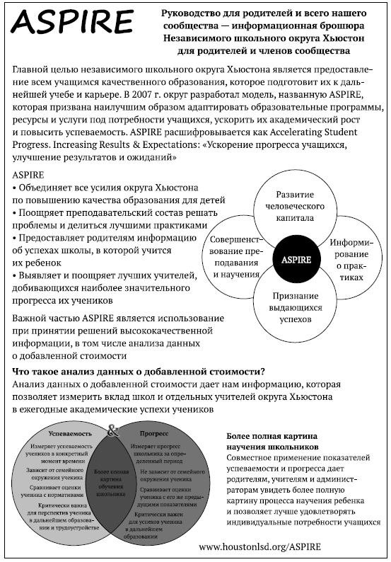 Целью своей работы с отчетностью по добавленной стоимости мы ставили улучшение ситуации. в этой книге мы описали многоэтапный процесс, опирающийся на информацию о добавленной стоимости, который поможет директорам и учителям обмениваться эффективными практиками, строить прочные взаимоотношения и разрабатывать стратегии по повышению успеваемости учеников. Мы также рассказали, что место жительства и семейное окружение ребенка определяют его местонахождение, но не говорят нам о том, куда он направляется. Зачем учителю продолжать работать с классом, в котором преобладают отстающие дети из неблагополучных семей, если поощряется лишь высокая успеваемость? Анализ данных о добавленной стоимости уравнивает шансы всех учеников (и всех учителей), отвечая на вопрос «что вы делали с вверенными вам учениками?», а не на вопрос «что за ученики вам достались?». Это инструмент XXI века, который позволяет измерять продуктивность.