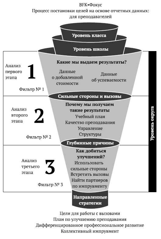 Успех таких учителей, как Бобби, Хизер и Кейти, вовсе не случаен. Все случаи преобразования на уровне школ и классов, описанные нами в этой книге, имеют общую основу: продуманное и целенаправленное применение пятиэтапного цикла улучшений преподавательской практики на основе данных о добавленной стоимости. хотя каждый из наших партнеров использовал цикл по-своему, первым шагом для них стало погружение в анализ данных о добавленной стоимости. На втором этапе они не пожалели времени на толкование полученных ими результатов и выявления своих сильных и слабых сторон. Далее – на третьем этапе – они сообща работали над определением глубинных причин своих самых главных успехов и неудач. На четвертом этапе они применили полученную информацию для разработки плана импрувмента. И наконец, они начали реализовывать план, контролировать результаты и при необходимости корректировать свои педагогические методы. Но на этом работа не заканчивалась. Следующий учебный год они начали с того, чтобы, получив свежие данные об успеваемости и добавленной стоимости, оценить эффективность своей прошлогодней программы и снова начать цикл анализа и совершенствования. всех преподавателей, описанных в наших историях успеха, объединяет упорное стремление улучшить обучение, смелость изменять устоявшиеся методы работы и пробовать новые стратегии. Мы верим, что и вы, будучи учителем, руководителем или администратором, сможете применить этот цикл, чтобы создать собственные истории успеха.