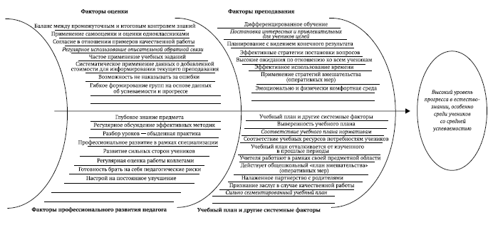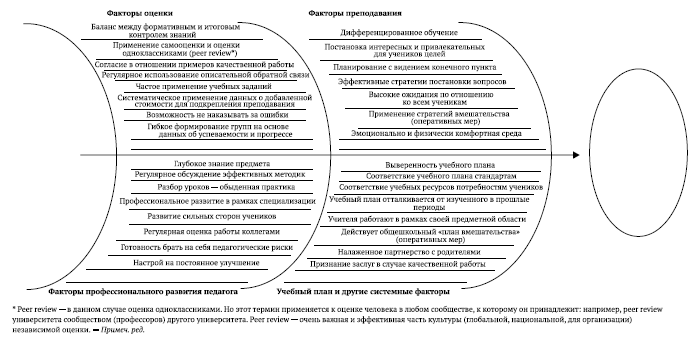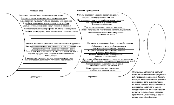 Могут ли другие учителя у них научиться? Конечно, могут. Одно из важнейших преимуществ анализа данных о добавленной стоимости в том, что в сочетании с другими источниками информации он позволяет выявить этих великих учителей и учиться у них. От школы к школе можно обнаружить огромное разнообразие эффективных педагогических стратегий и методов. Великие учителя есть везде, главное – найти их, предоставить возможность таким учителям использовать свой талант на пользу другим, а их коллегам – учиться у них. Работа таких педагогов идеально соответствует семиэтапному процессу оценивания (см. с. 33), который мы описали на страницах этой книги. это личности, способные помочь другим мыслить критически. Для этого целесообразно использовать приведенные выше диаграммы Исикавы, чтобы определить конкретные глубинные причины отчетных результатов и найти способы улучшить ситуацию.