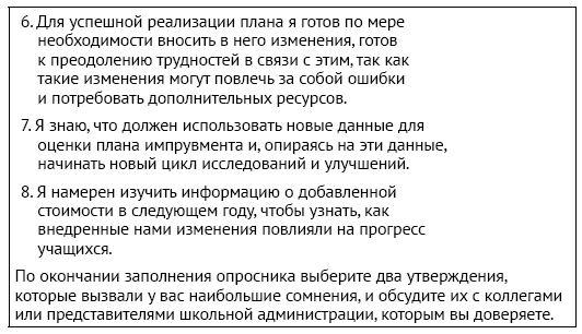 Мы считаем, что последовательный подход к импрувменту, который мы пропагандируем в этой книге, будет способствовать распространению концепции анализа данных о добавленной стоимости для повышения эффективности педагогов. Анализ отчетов по добавленной стоимости должен помогать находить, расследовать и исправлять, а не просто называть, обвинять и стыдить. Конечно, это потребует значительных усилий по преобразованию, а также ресурсов, включая такой важный из них, как руководство.