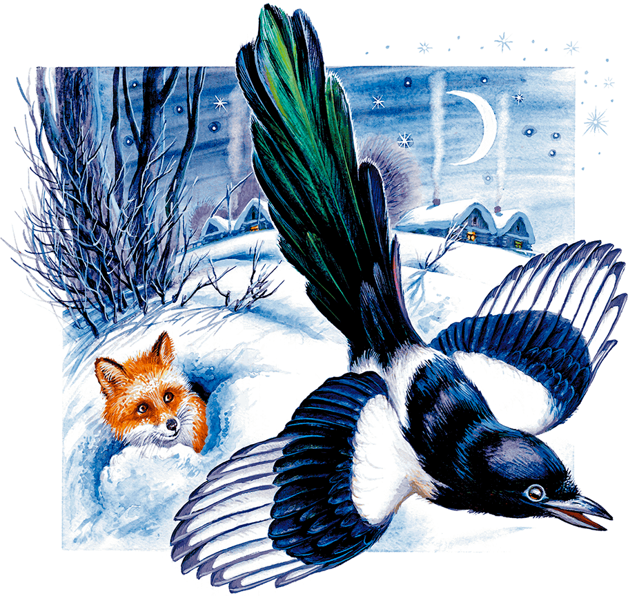 Сорока была опытная, старая и нарочно летела у самой земли, потому что от деревень и лесом всё-таки тянуло теплом и сорока не боялась замёрзнуть. Никто её не видел, только лисица в осиновом яру высунула морду из норы, повела носом, заметила, как тёмной тенью пронеслась по небу сорока, шарахнулась обратно в нору и долго сидела, почёсываясь и соображая, – куда ж это в такую страшную ночь подалась сорока?