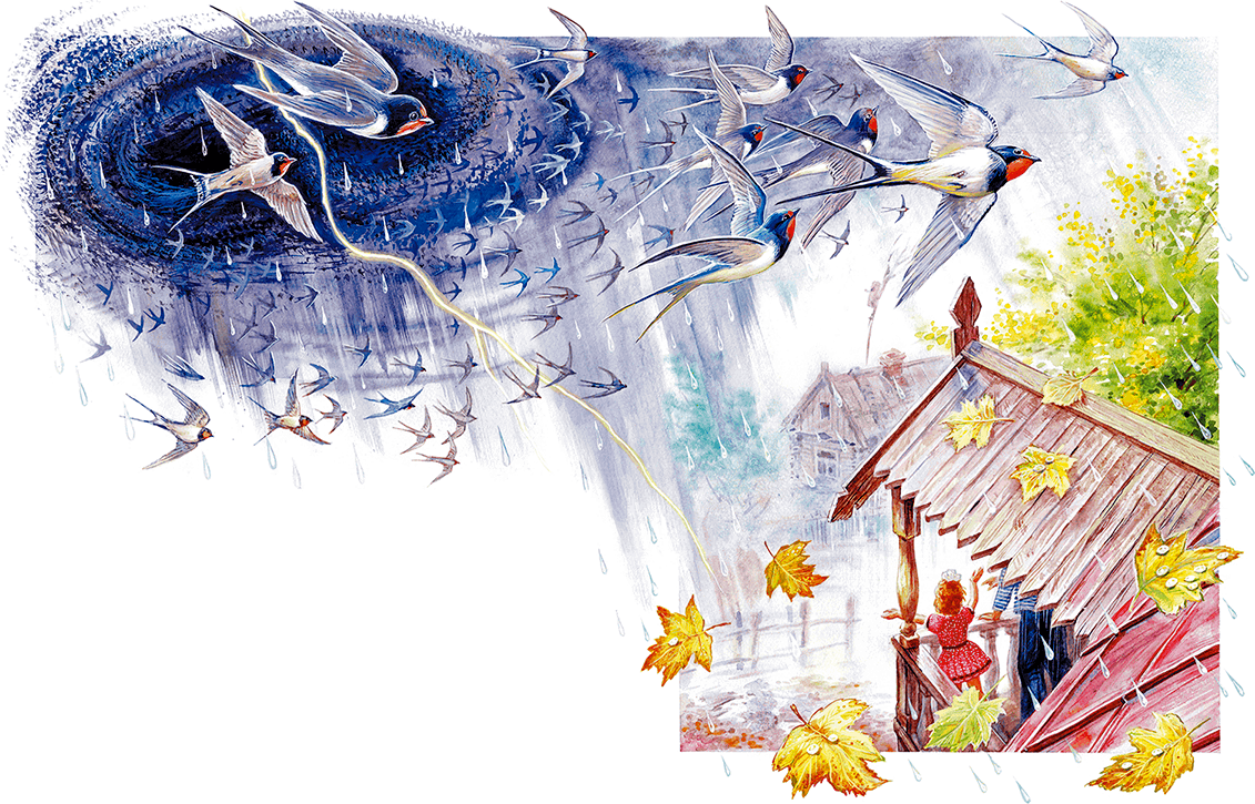 – Это как так не можем? – рассердилась ласточка. – Кто это тебе сказал? Мы всё можем. Даже увернуться от молнии и обогнать самолёт. Для нас дождь привести – пустое дело. Только надо всех ласточек собрать, со всей области. – Ласточка почесала клюв лапкой, подумала. – Ну ладно! Не реви. Пригоним сюда дождь.