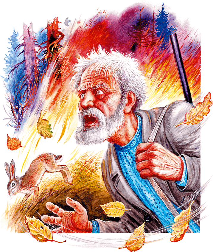 Дед обрадовался зайцу, будто родному. Как старый лесной житель, дед знал, что звери гораздо лучше человека чуют, откуда идёт огонь, и всегда спасаются. Гибнут они только в тех редких случаях, когда огонь их окружает.