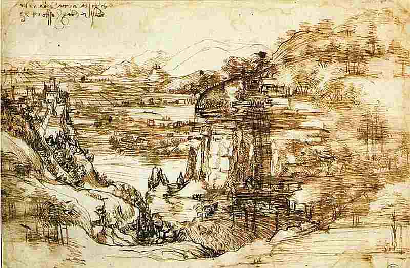 Пейзаж. 1473. Бумага, тушь, перо. Галерея Уффици, Флоренция