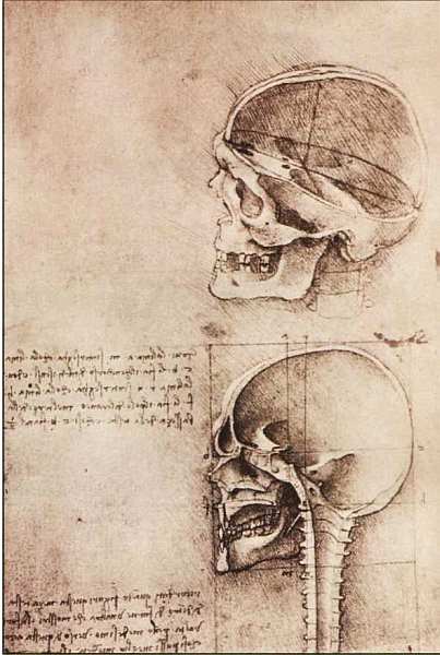 Штудии человеческого черепа. 1489. Бумага, тушь, перо, уголь. Королевская библиотека, Виндзор