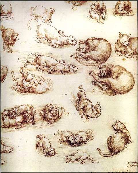 Зарисовки кошек, драконов, и других животных. 1513–1515. Бумага, тушь, перо, уголь. Королевская библиотека, Виндзор