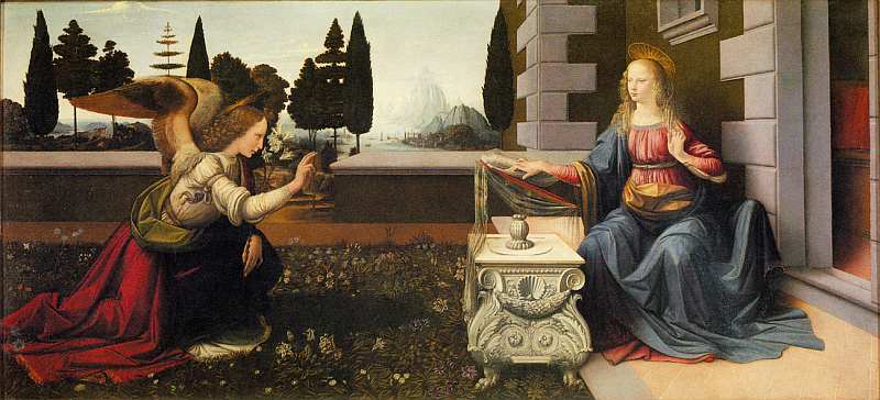 Картина «Благовещение» (1472–1475, Лувр, Париж) написана в самом начале творческого пути живописца. Полотно с изображением Благовещения было заказом для одного из монастырей в окрестностях Флоренции. Однако не все исследователи творчества Леонардо уверены, что оно является полностью самостоятельной работой двадцатилетнего художника. Хотя, впрочем, споры вокруг авторства этой и многих других картин Леонардо — отнюдь не редкость.