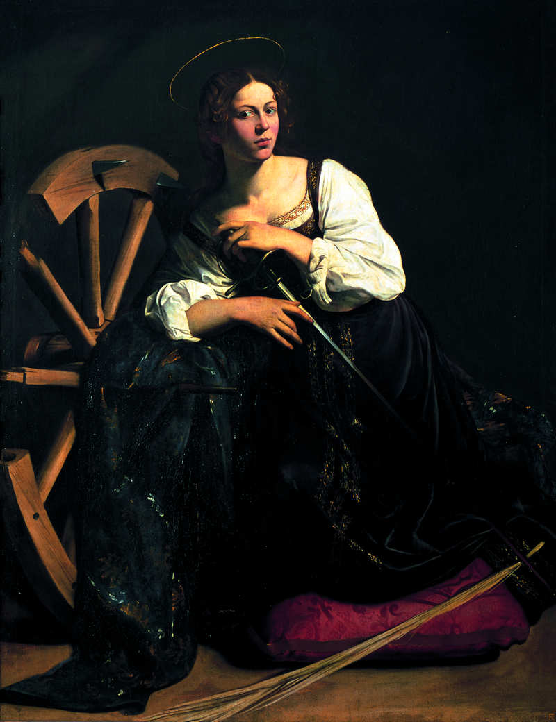Недовольные церковники еще могли как-то смириться с тем, что куртизанка позирует в роли Марии Магдалины, но было совсем уж возмутительно, когда ее же Караваджо изобразил в образе святой Екатерины Александрийской рядом с зубчатым колесом, орудием ее мучений, и какой-то шпагой – по-видимому, той самой, которой он орудовал на дуэлях. Картина представляет нам нечто прямо противоположное традиционному образу хрупкой и непорочной ангелоподобной святой. Эта Екатерина излучает силу и даже опасность, глаза ее сверкают, как два клинка. Если на Караваджо слишком наседали, обвиняя его в нарушении приличий, он оборачивал обвинения против самих критиков, говоря, что они по своей тупости понимают все превратно. Почему шея святой так неподобающе обнажена? – Ну, понятно же! Для того, чтобы напомнить, что она была обезглавлена. – А почему она одета в роскошное, украшенное вышивкой платье из бархата и камчатной ткани, которое больше подходит самой Филлиде, когда она принимает своего знатного флорентийского покровителя и любовника Джулио Строцци? – Вы забываете, что Екатерина была принцессой, наделенной спокойным и решительным характером, а не нервной особой, закатывающей глаза от ужаса. Необходимо было подчеркнуть, что она выдающаяся личность, с которой надо считаться.