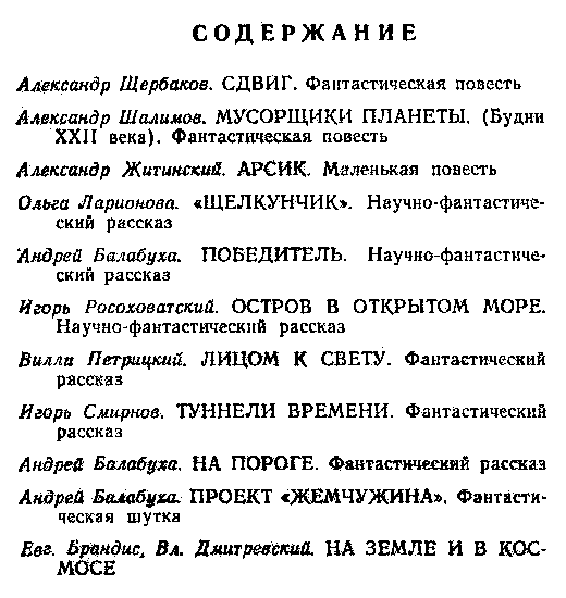 Именно разработке этих важнейших тем настоящего и будущего нашей планеты посвящены три центральных произведения сборника: повести А.Щербакова «Сдвиг», А.Шалимова «Мусорщики планеты» и А.Житинского «Арсик». Повести очень разные. И по времени действия, и по творческим приемам, и по начертанию сюжетных линий, и по стилю Но объединяет их убежденность, что НТР сама по себе, в отрыве от общественного сознания, не может быть источником благоденствия. Ведь главное заключается в гармоническом сочетании прогресса науки и техники с прогрессом социальным и совершенствованием нравственности.