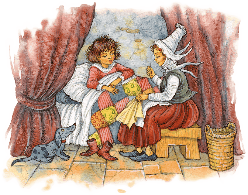 А пир тем временем шел своим чередом. До тех пор, пока Лысый Пер вдруг не свалился без чувств от усталости. Несмотря на свой почтенный возраст, он провел вместе со всеми прекрасный, веселый день, но теперь силы изменили ему, и, когда он пришел в себя, разбойники отвели старика в его каморку. Очень довольный, он повалился в полном измождении на свою кровать, и Рони укрыла его меховым одеялом.