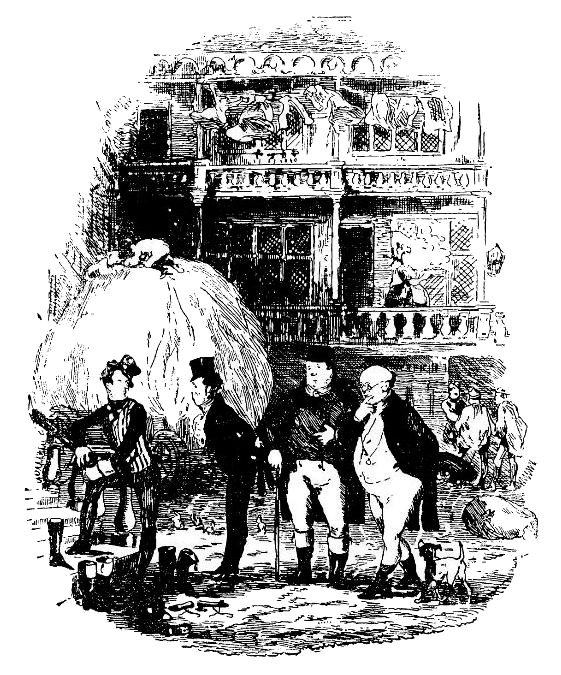 Возница соскочил, и мистер Пиквик вышел из кэба. Мистер Тапмен, мистер Снодграсс и мистер Уинкль, нетерпеливо ожидавшие прибытия своего славного вождя, подошли его приветствовать.