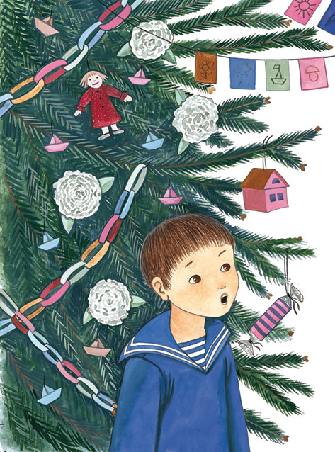 Но уже нет ни домика, ни мальчишки, ни кошки – стоит в поле завод. Поле белое, трубы красные. Дым чёрный, а свет жёлтый. Интересно, что на этом заводе делают? Вот будка, и, укутанный в тулуп, стоит часовой. Часовой в тулупе огромный, широкий, и винтовка его кажется тоненькой, как соломинка. Однако попробуй-ка, сунься!