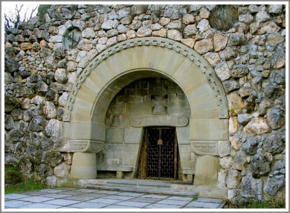 А чувствуете, как легко сбегать с Мертвой долины к морю? На пути ведь к пушкинскому Лукоморью больше нет возвышенностей. Хотя, стоп — а справа от нас что скрывается под хмурыми ливанскими кедрами и кипарисами? Извиняюсь, чуть не забыл: там, на каменистом холме, находится историко-архитектурный памятник «Склеп Владимира Березина», бывшего хозяина здешних мест. Охраняют вход в склеп десять кипарисов — по пять с каждой стороны. Сам склеп — это высокая каменная ниша с крестом над ней. Построена по проекту императорского архитектора Николая Краснова, автора Ливадийского дворца. Внутри склепа сохранились остатки мозаичных икон святых Владимира и Ольги [Ольгой, напомню, звали супругу Березина]. Кажется, в середине 30-х их пытались сбить… и не получилось. Не позволили святые безбожникам надругаться над своими образами.