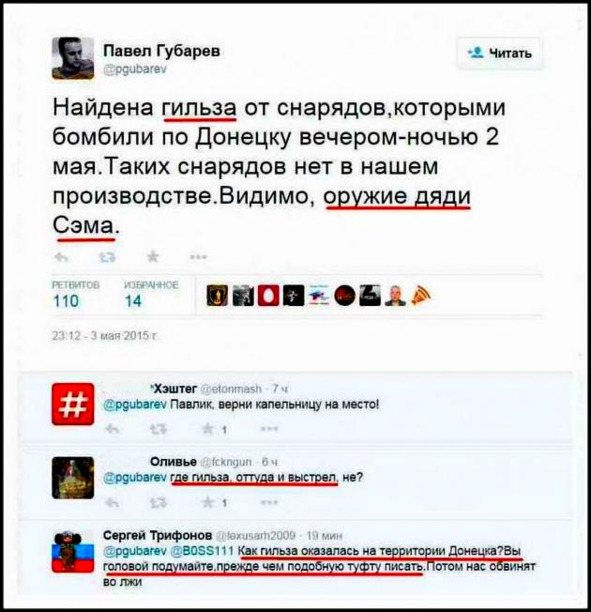 Тогда же — в мае 2015 года, Интернет потешило сообщение одного из донбасских «вождей», который в Донецке нашел… гильзу от снаряда, заявив, что это — «оружие дяди Сэма».