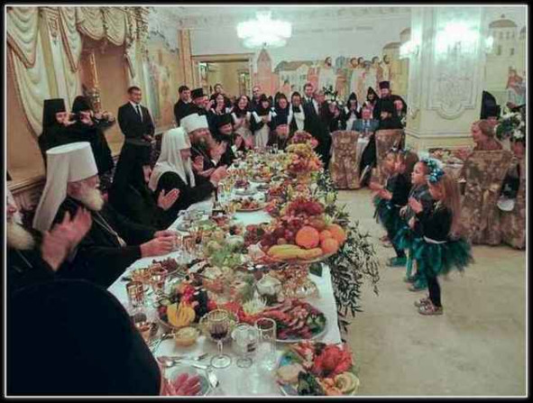 На этом ставим точку и оцениваем фото, на котором запечатлен всероссийский патриарх Кирилл, восседающий во главе стола со «скромными» яствами [кто сказал, что в России кризис?] и лицезреющий, как перед столом вытанцовывают — в угоду Кириллу и его свите, крохи-девчушки.