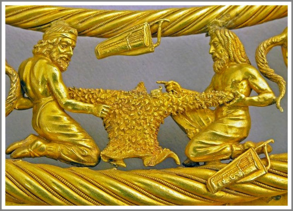 Перво-наперво внимание исследователя привлекли центральные фигуры пекторали [диаметром она, кстати, 30,6 см, весит 1,15 кг. Изготовлена из золота 585-й пробы] — два скифа, которые держат в руках золотое руно — шкуру барана. «Или карту древней Скифии, — полагает Сергей Макарович. — Ныне это территория Украины. На пекторали, правда, карта перевернута, так как ориентирована была не на север, как современные карты, а на юг. Треугольный выступ на карте означает древний Крым, а справа от него находится рог для пития воды. Это современный Днепр». Ну а самое главное, на пекторали указано возможное местонахождение тайного некрополя скифских царей в Северном Причерноморье — под нынешним Мелитополем, где скифы прятали дань с покоренных народов и свои добытые и награбленные сокровища. Его прикрывает рукой левый скиф. Как бы подчеркивая особую защиту этой территории.