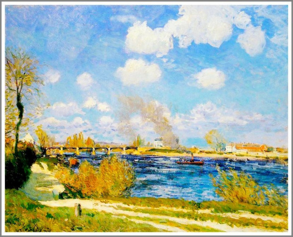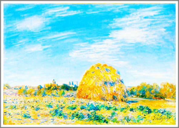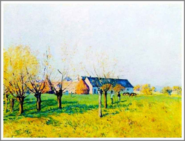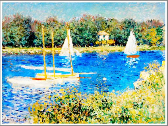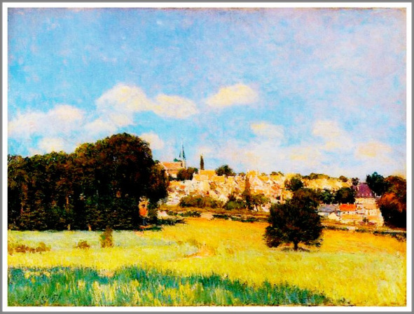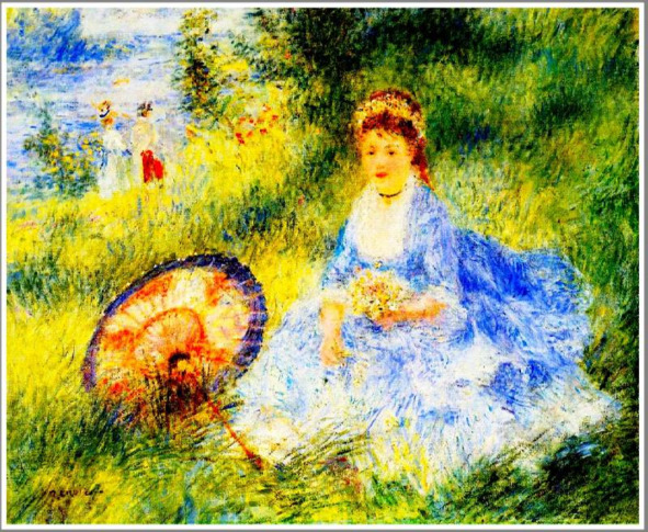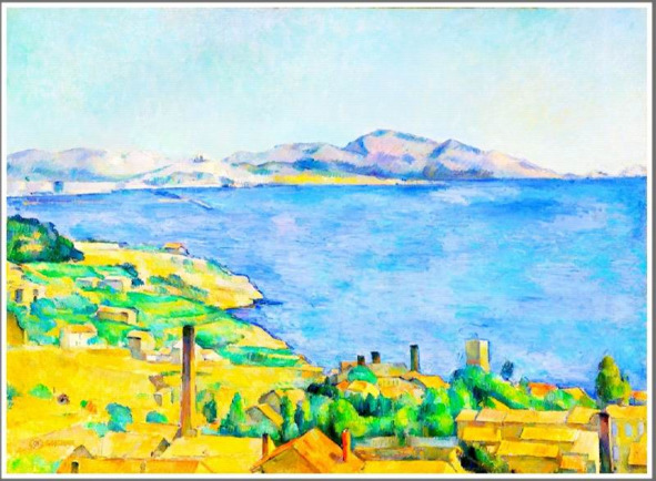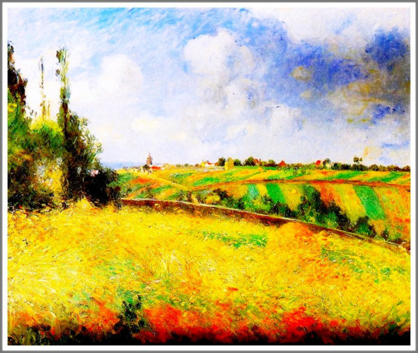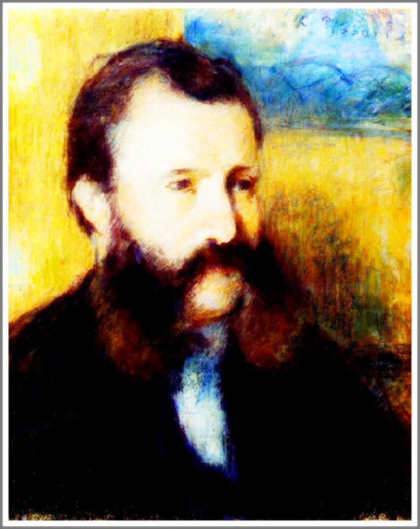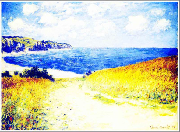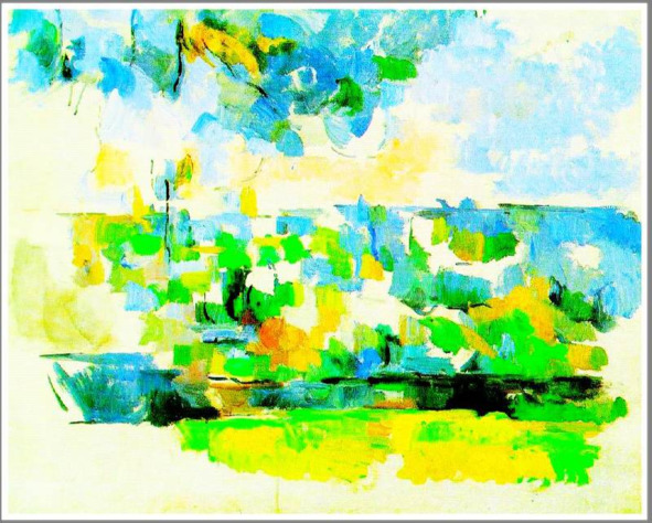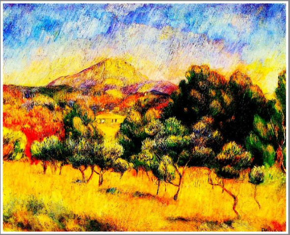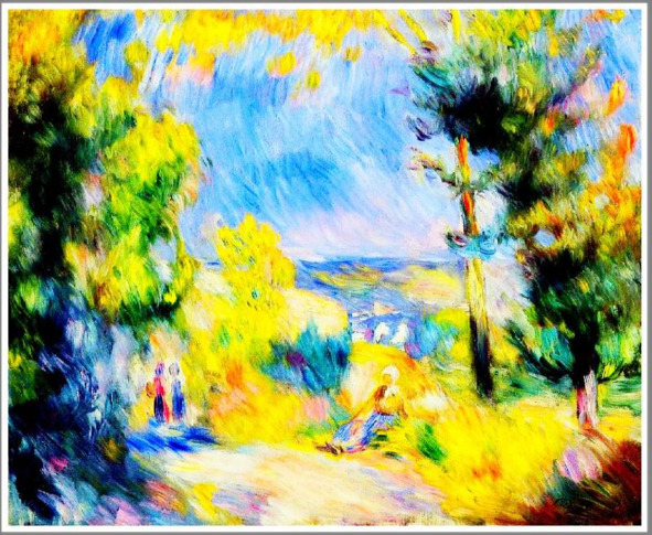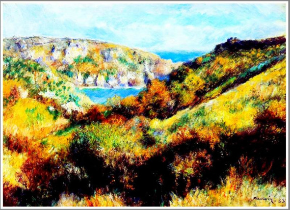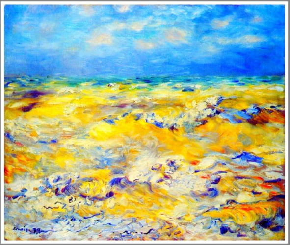 Это относится, в первую очередь, к картинам Камиля Сислея [«Закат и туман в Эраньи», например] или Пьера-Огюста Ренуара, который так умел работать с синим и жёлтым цветами, что на его полотнах появился совершенно новый, невиданный доселе цвет [«Морской пейзаж», скажем]: синий, прорастающий сквозь жёлтый, к примеру. Или жёлтый, прорастающий сквозь синий. Цвета, по сути, — два, а создается впечатление, что он — один: просто сине-жёлтый, как флаг моей родины.