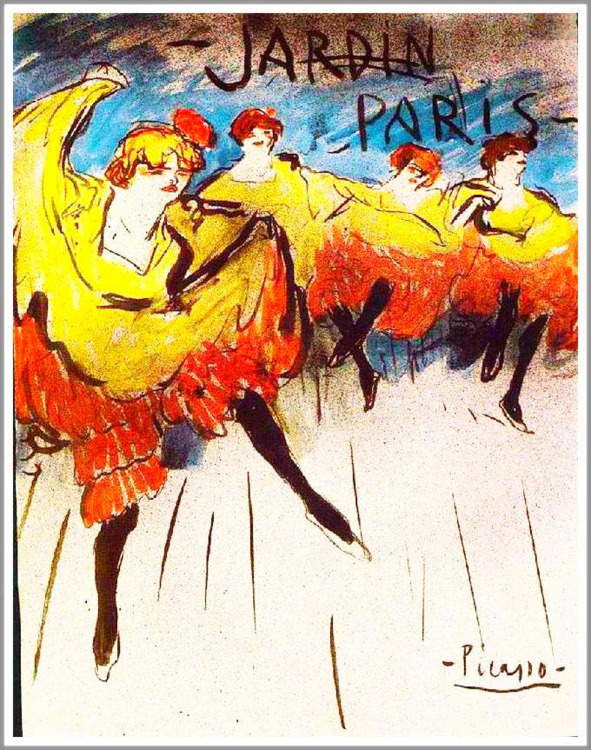 Изображены на ней, естественно, танцовщицы, которые готовятся к выходу на сцену, разминаясь у… синей стены. А во что они одеты, понятно из названия картины.