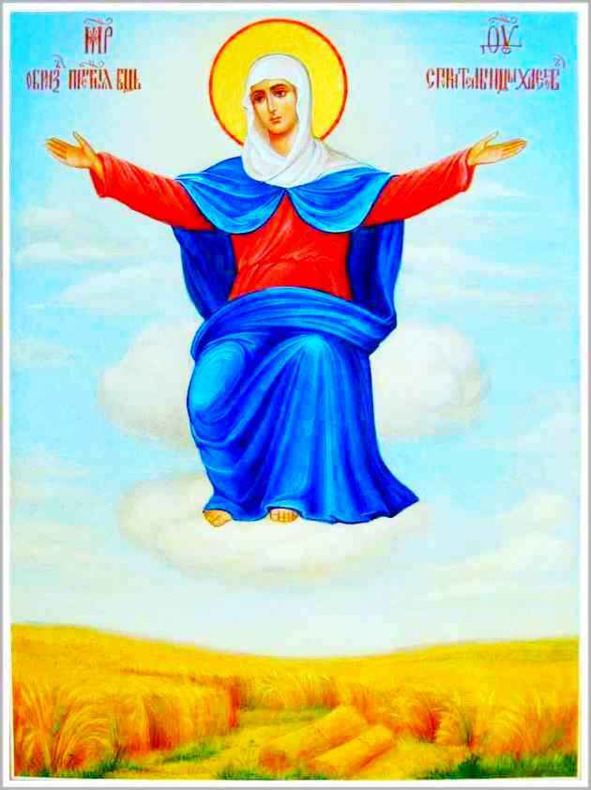 На третьей иконе Богородица изображена без Богомладенца, восседающей — с широко раскрытыми руками, на облаке над хлебным полем.