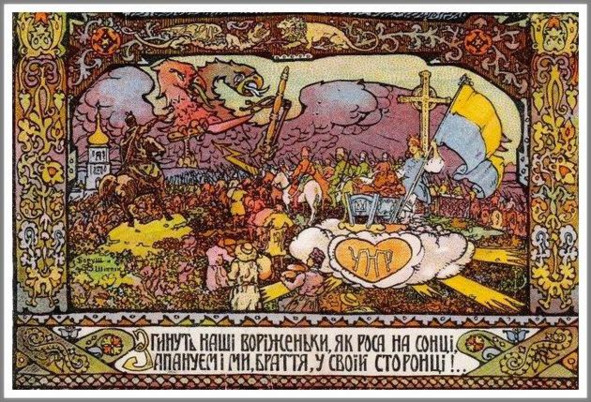 За спинами этой колоритной троицы отчетливо просматриваются… сине-желтый флаг и пика, обернутая красно-черными лентами, тоже очень похожая на флаг. Получается, красно-черные цвета [говорю пока только о них] в качестве символа борьбы за свободу казаки-запорожцы использовали задолго до славных сечевых стрельцов и не менее славных воинов УПА.