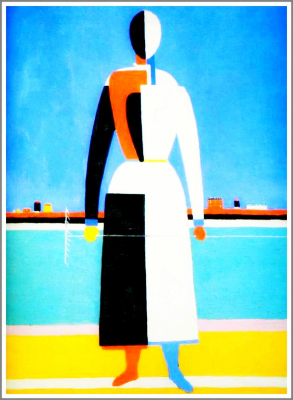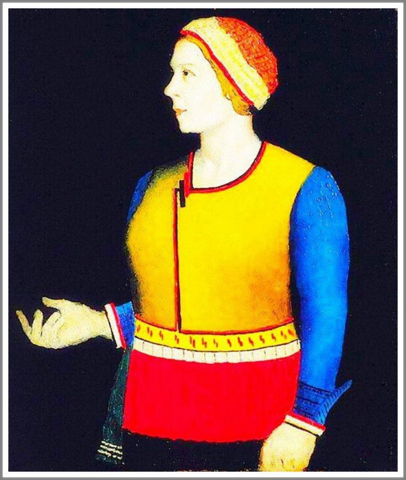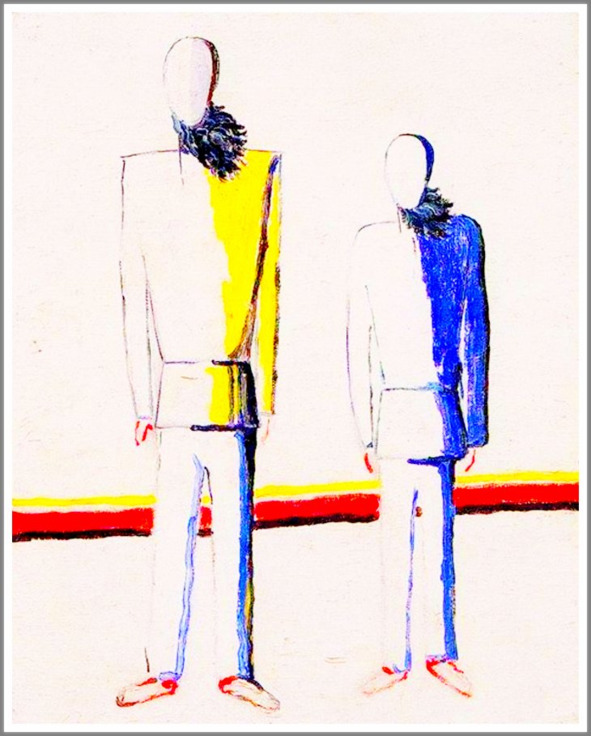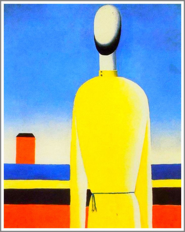 Или его же работа «Сложное предчувствие (Торс в желтой рубашке)» [1932], в которой присутствуют и государственные украинские цвета, и украинские боевые, скажем так, — красный и черный: