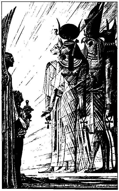 Атон поднял глаза и всмотрелся в лица древних богов, стоявших перед ним,- в таинственный кошачий лик Бастет, в нежные черты богини Изис, излучавшие материнское тепло, как и три тысячи лет назад, в мрачные птичьи глаза Гора, внимательно и недоверчиво изучавшие* его, в гордое лицо Анубиса.