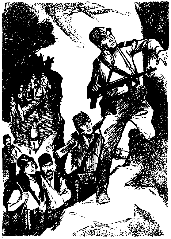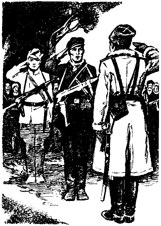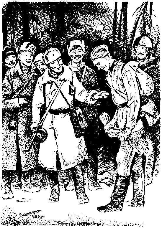 Партизан крепко и ласково колотит по плечу сына. Тот пошатывается от этих ударов, но упрямо стоит.