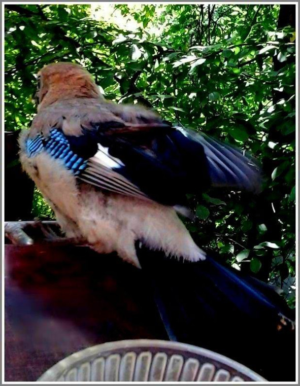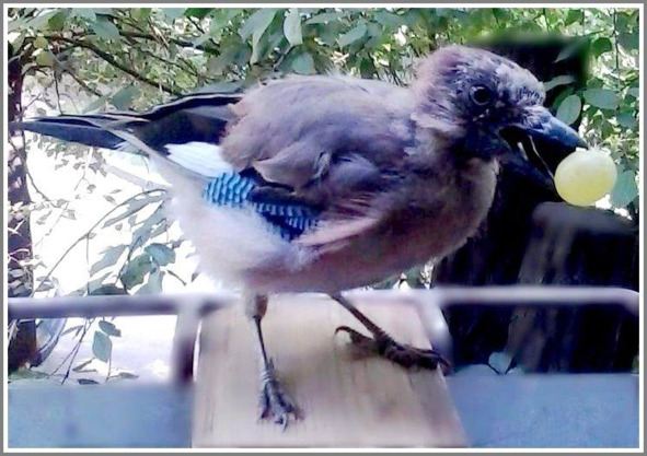 Кстати, сойки, которые живут у нас во дворе — мы их давно заприметили и иногда, когда подлетают ближе, подкармливаем их, в этот раз — после появления у нас Сойкина, тоже наведывались к нам.