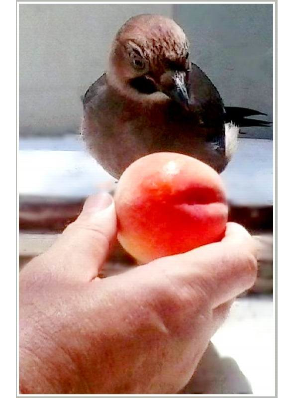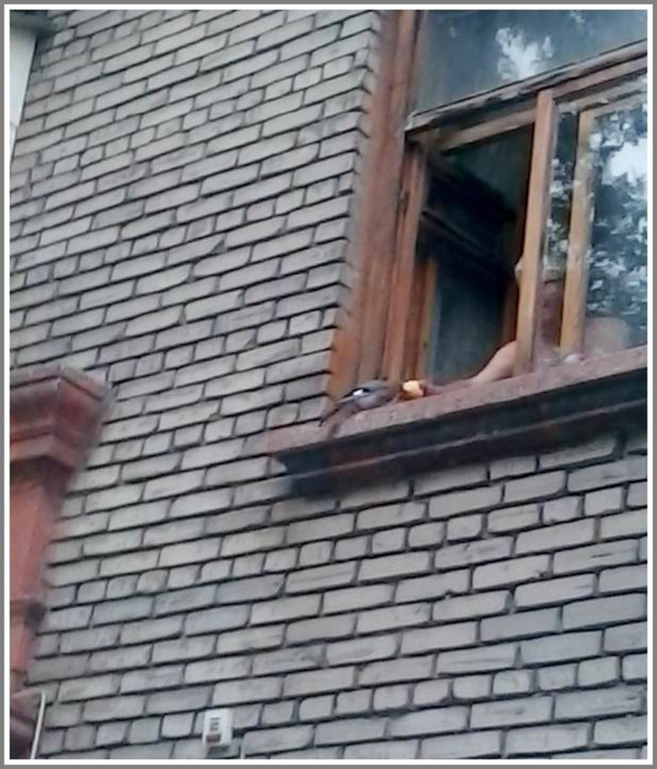 Ничего особенного: птенца сойки подкармливают яблоком из открытого окна на втором этаже