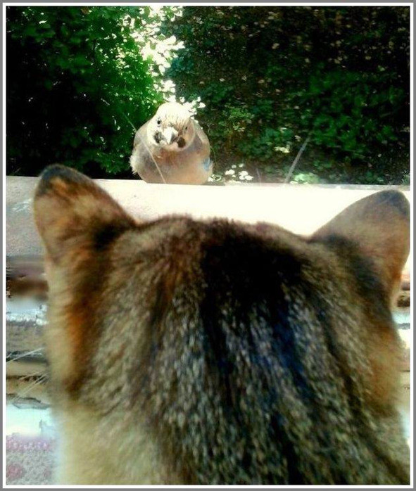 Ну и вот какой казус с Сойкиным как-то приключился: прилетев на завтрак, он ошибся окном и оказался рядом… с кошкой Зосей, которая в свободное ото сна время назначает себя дежурной по двору и следит, не спускаясь с подоконника, за порядком на подконтрольной ей территории.