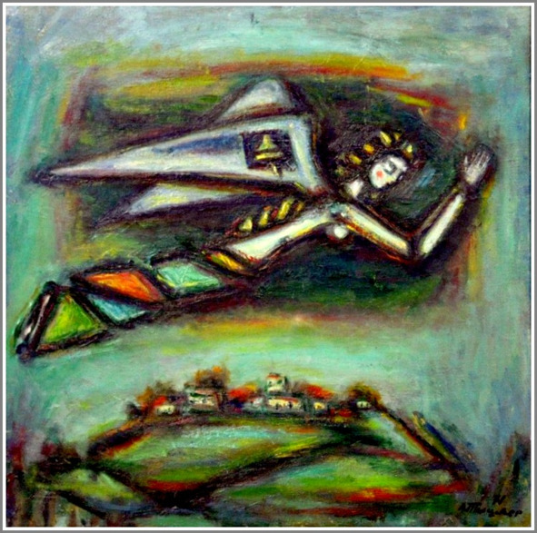 Ну а, ностальгией по Медовому городу, полузабытым воспоминанием о нем можно считать картину Тышлера «Женщина и аэроплан». На ней изображена девушка с обмотанной красным шарфом шеей, скрещенными на груди руками, которая удивленно смотрит вверх на маленький, напоминающий саранчу в полете, самолетик. Мелитопольский литератор Сергей Авдеенко полагает, что родилась работа под впечатлением полетов одного из первых русских авиаторов Сергея Уточкина, проходивших в Мелитополе в 1912 году. Музейный номер дореволюционной газеты «Мелитопольские ведомости» донес до нас сведения о том, что посмотреть на это чудо собралось на летном поле более 15 тысяч человек — едва ли не все население города. Саша Тышлер тоже там был.