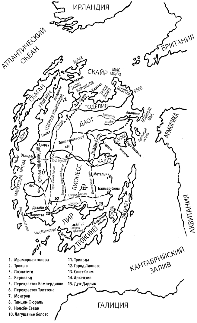 (обратно)К этому времени между Тройсинетом и Лионессом установилось неустойчивое перемирие, обусловленное обязательством короля Казмира не строить военные корабли, создающие угрозу контролирующему моря тройскому флоту. Эйлас изложил свою позицию Казмиру в следующих выражениях: «Ваши армии — четыреста рыцарей и тысячи солдат — надежно защищают Лионесс от нашего нападения. Если же лионесские войска высадятся в Дассинете или Тройсинете, нам будет угрожать смертельная опасность! Мы не можем предоставить Лионессу никакой возможности осуществить такую высадку».