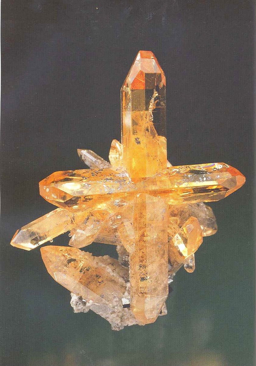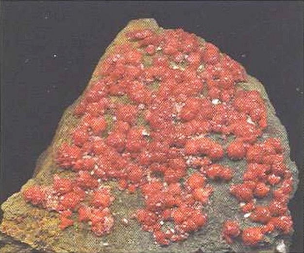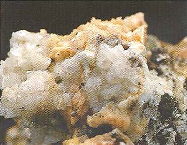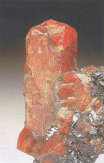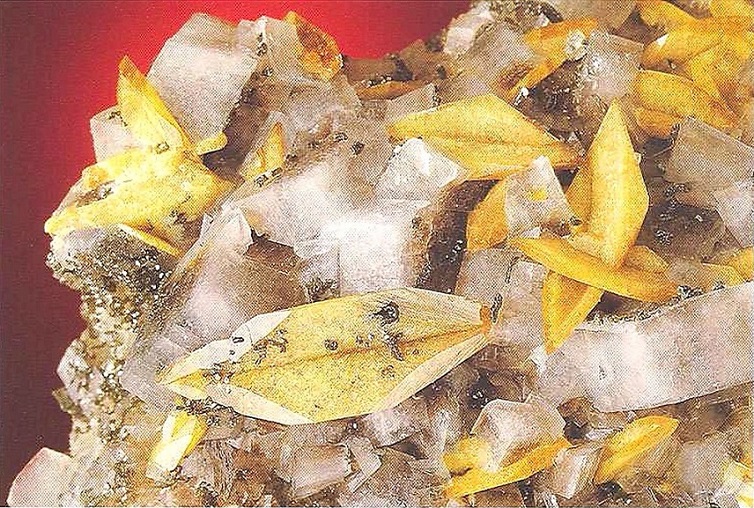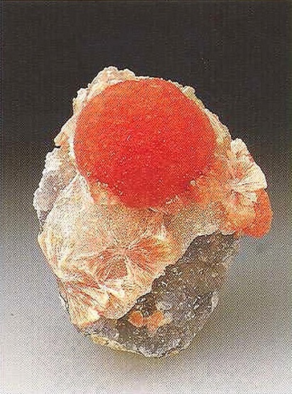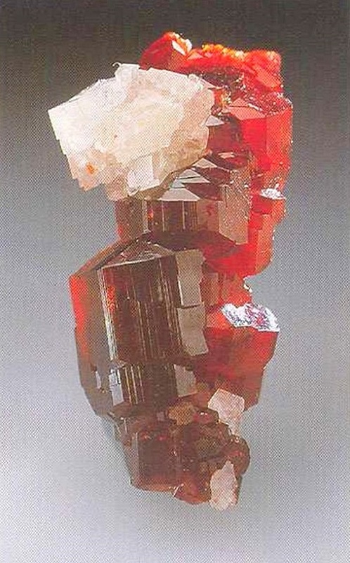 Свойства: Ц — красный, оранжевый, светло-коричневый до желтоватого; Ч — белая; Б — стеклянный; П — прозрачный до просвечивающего; УВ —4,3; Т — 7–7,5; СП — отсутствует; ИЗ — раковистый до неровного; М — хорошо сформированные кристаллы, зерна.