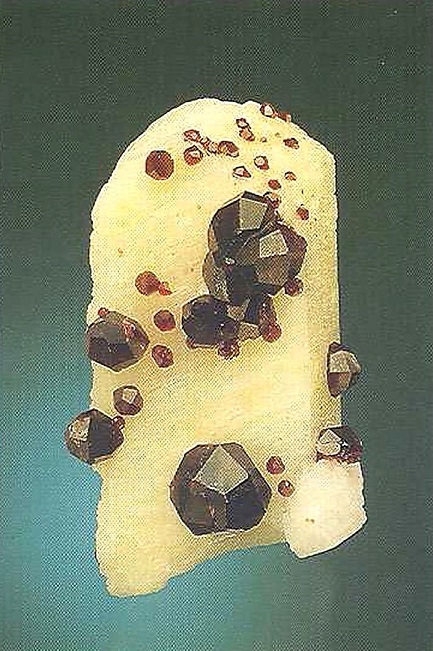 Свойства: Ц — темно-красный, черно-коричневый, коричневый, зеленый до желто-зеленого (демантоид), черно-коричневый до черного (меланит); Ч — белая; Б — стеклянный; П — прозрачный до просвечивающего; УВ — 3,9; Т — 6,5–7; СП — отсутствует; ИЗ — раковистый до неровного: хорошо сформированные кристаллы, терна.