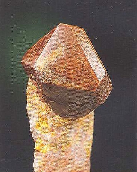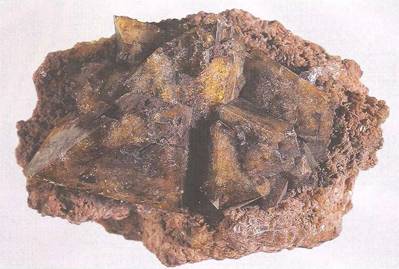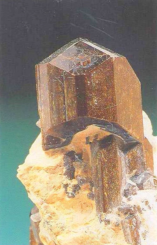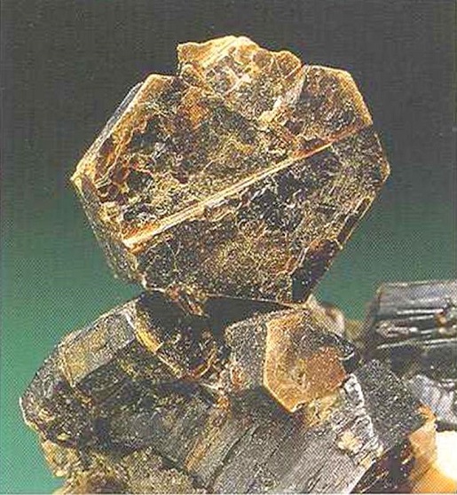 Свойства: Ц — темно-коричневый до светло-коричневого, желтый; Ч — белая; Б — матовый до стеклянного; П — прозрачный до непрозрачного; УВ — 3,7; Т — 7–7,5; СП — хорошая; ИЗ — неровный; М — хорошо сформированные призматические до таблитчатых кристаллы и их комбинации, крестообразные двойники, зерна.
