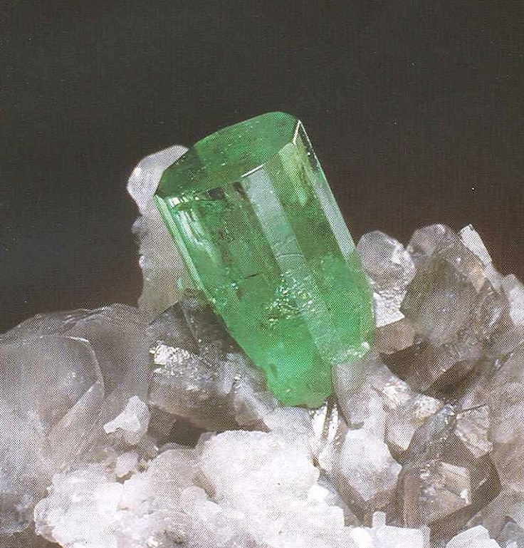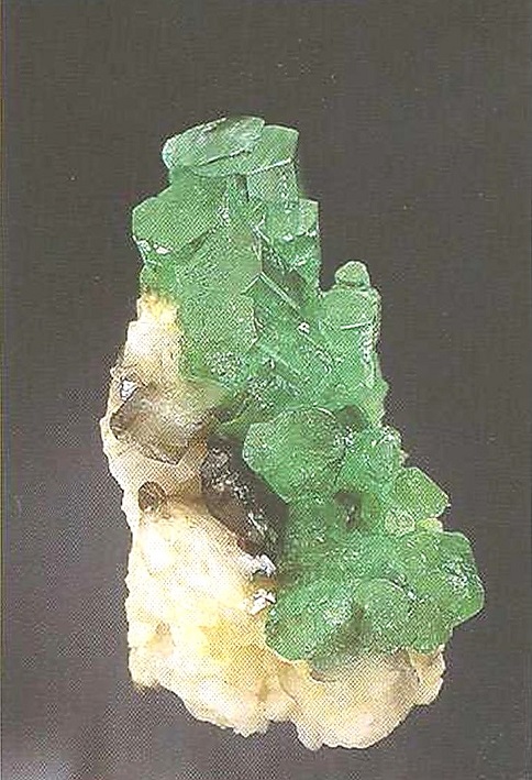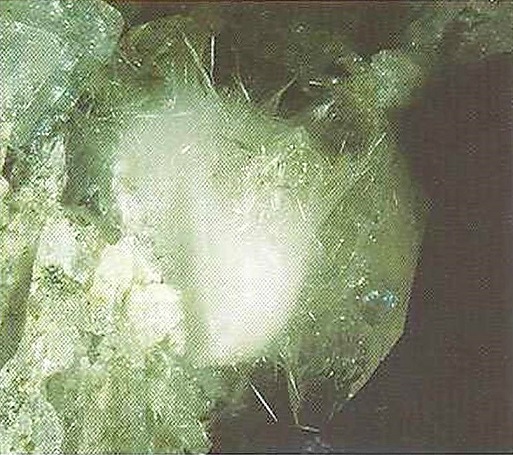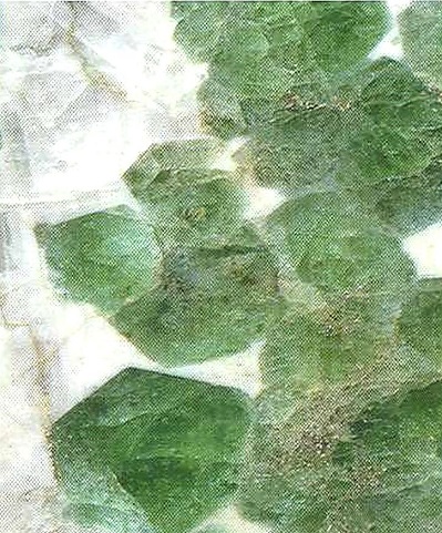 Свойства: Ц — темно-изумрудно-зеленый; Ч — белая; Б — стеклянный; П — прозрачный до просвечивающего; УВ — 3,9; Т — 6,5–7; CП — отсутствует; ИЗ — раковистый до неровного; М — хорошо сформированные кристаллы, зерна.