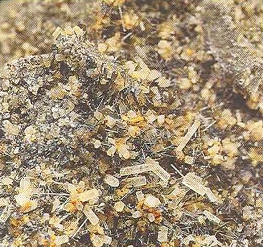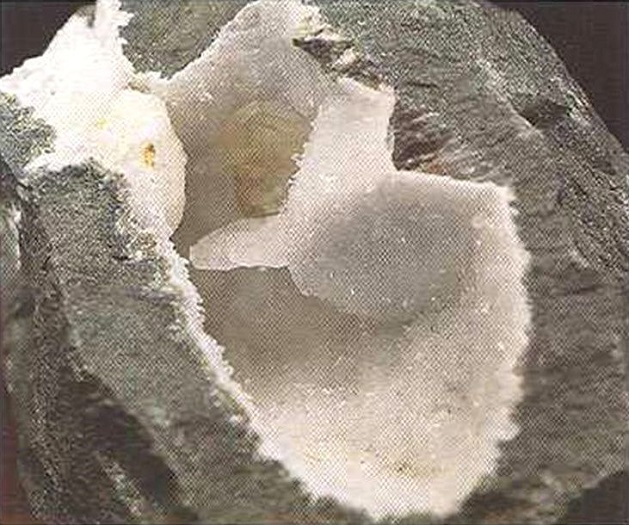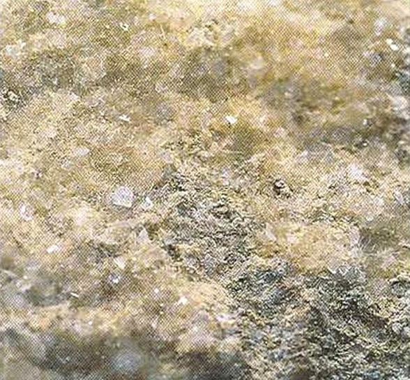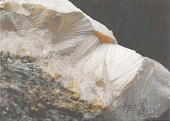 Свойства: Ц — белый, серый, зеленоватый, желтоватый; Ч — белая; Б — стеклянный до тусклого; П — прозрачный до просвечивающего; УВ — 3,3; Т — 6,5–7,5; СП — хорошая; ИЗ — неровный; М — длиннопризматические кристаллы неправильной формы, волокнистые агрегаты, зерна.