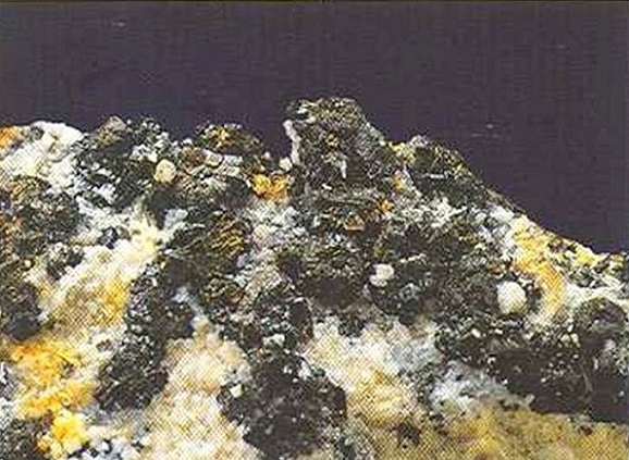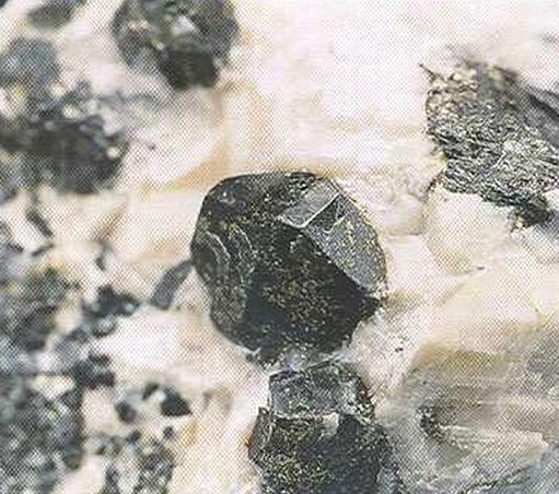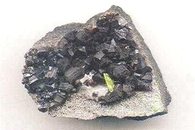 Свойства: Ц — черно-зеленый до черного; Ч — серая; Б — матовый до стеклянного; П — непрозрачный; УВ — 4,2; Т — 6,5–7; СП — хорошая; ИЗ — раковистый до неровного; М — призматические кристаллы неправильной формы, зерна.