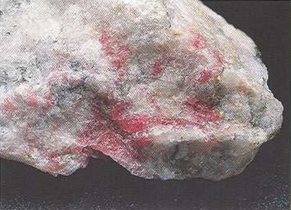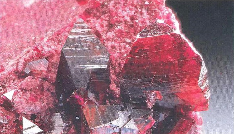 Свойства: Ц — красный до лилово-красного, чёрно-лиловый, чёрно-коричневый; Ч — белая; Б — стеклянный; П — прозрачный до просвечивающего; УВ — 3,5; Т — 7–7,5; СП — отсутствует; ИЗ — раковистый до неровного; М — изометрические кристаллы, зерна.