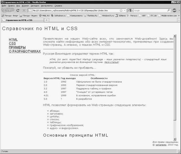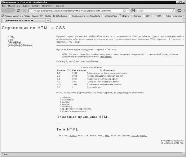 В результате читатель создаст полнофункциональный Web-сайт — справочник по HTML и CSS. Конечно, это только пример — данные технологии можно применить и для разработки любого другого Web-сайта.