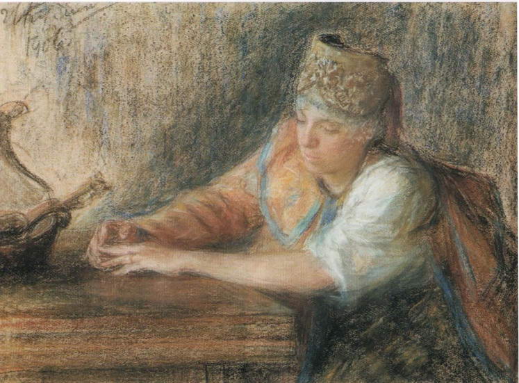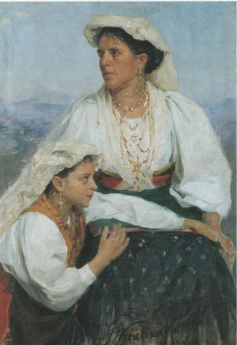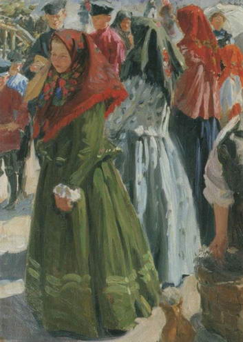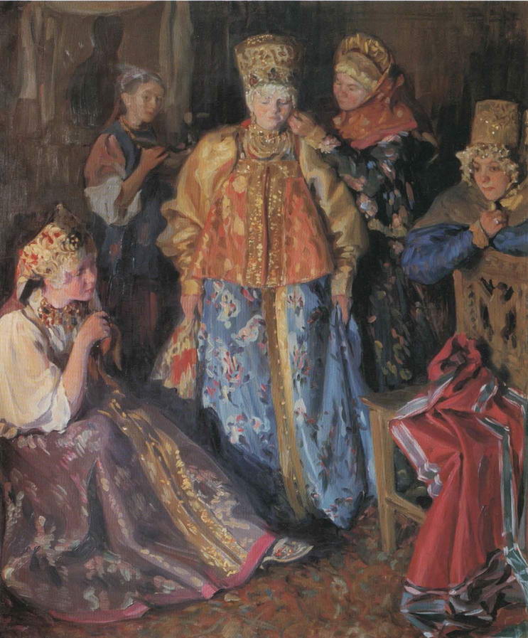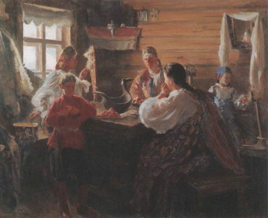 Особенно удались художнику две небольших композиции - этюды Деревенские портные и Нарядилась (1897), в которых художник поборол академическую сдержанность и написал в репинской манере, ставшей характерной для дальнейшего творчества.