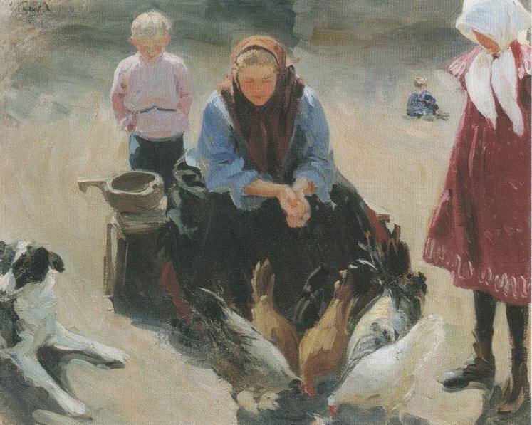 На той же выставке Куликов выставляет несколько этюдов, выполненных во время летнего отдыха, среди них - Деревенский охотник, Дворник, Старуха в красном, Девушка с курами. В дальнейшем сюжет с курами будет им повторен в известной картине Бабушка с курами, имевшей несколько вариантов. В какой-то мере, подражая своему учителю, этюды он делает свободно, размашисто, яркими и сочными.