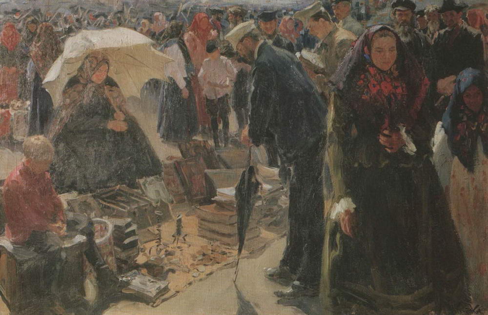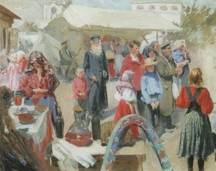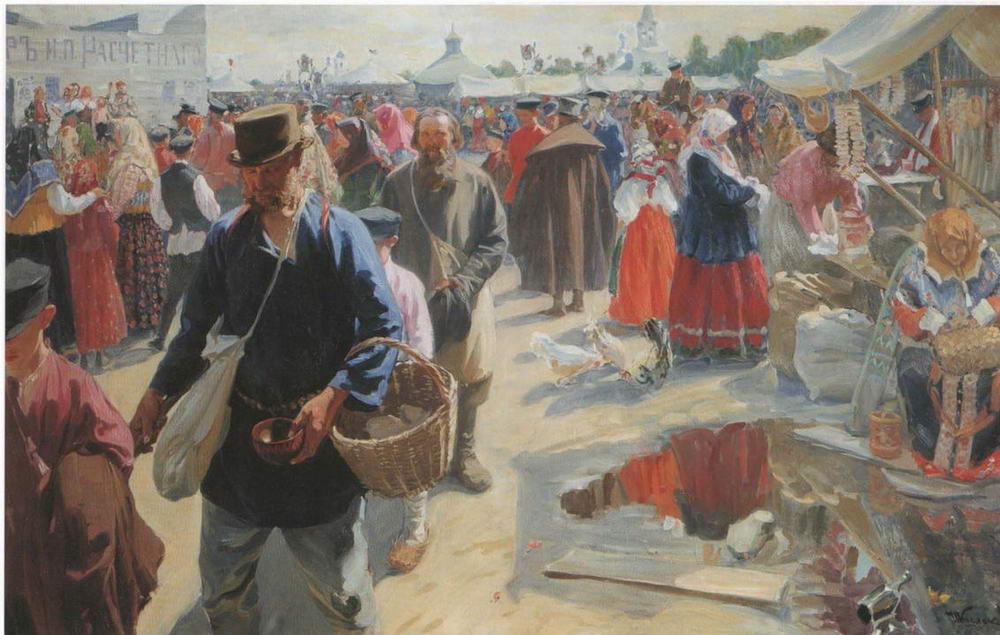 На Кустодиева большое впечатление оказал муромский базар во время посещения Мурома в летние каникулы 1899 года. Подобные базары вообще были характерны для провинциальных городов, и Кустодиев посчитал своевременным запечатлеть эту особенность. Куликов решил остановиться на иной теме - «Чаепитие в крестьянской избе», и в связи с этой работой появляются многочисленные эскизы и композиции в разной технике (живопись, сангина, пастель). Попов для своей конкурсной работы избирает тему изображения компании молодых людей под названием Встреча.