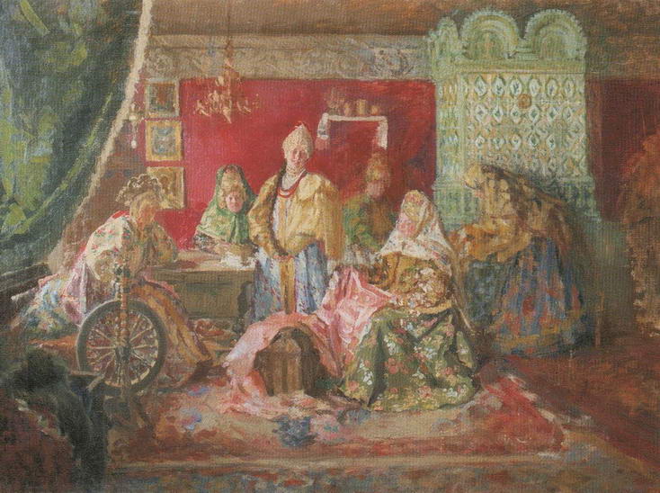 Для многих жанровых композиций Куликову позировали его племянницы, отличавшиеся красотой и статностью. Они были хороши и в роли прях и жниц, умевших управляться с разными работами, и невест, которых бояре прятали в теремах от сглаза.