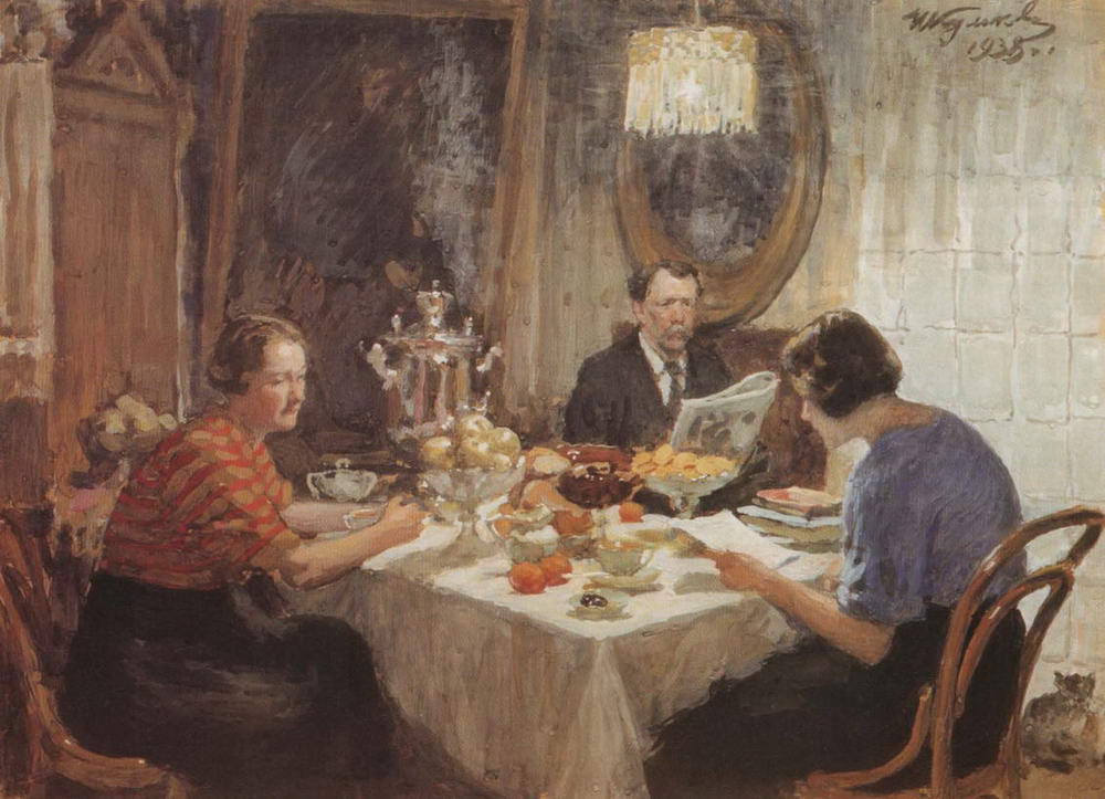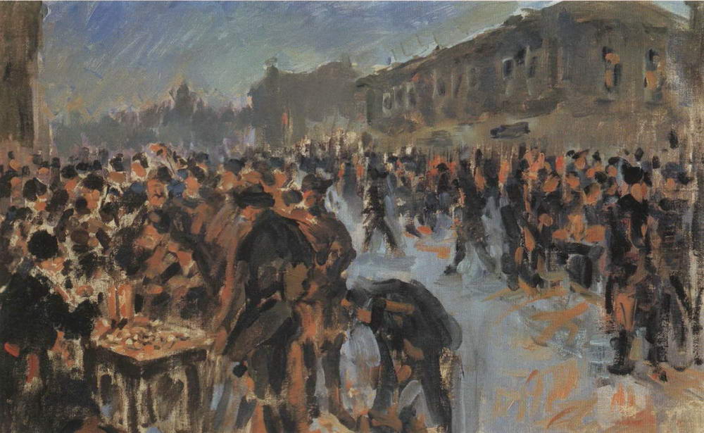 Вдохновленный предложением Ильи Ефимовича, Куликов возвращается в Петербург, прервав работу над конкурсной картиной. Вместе с Кустодиевым во время заседаний они делают карандашные наброски и этюды на холсте.